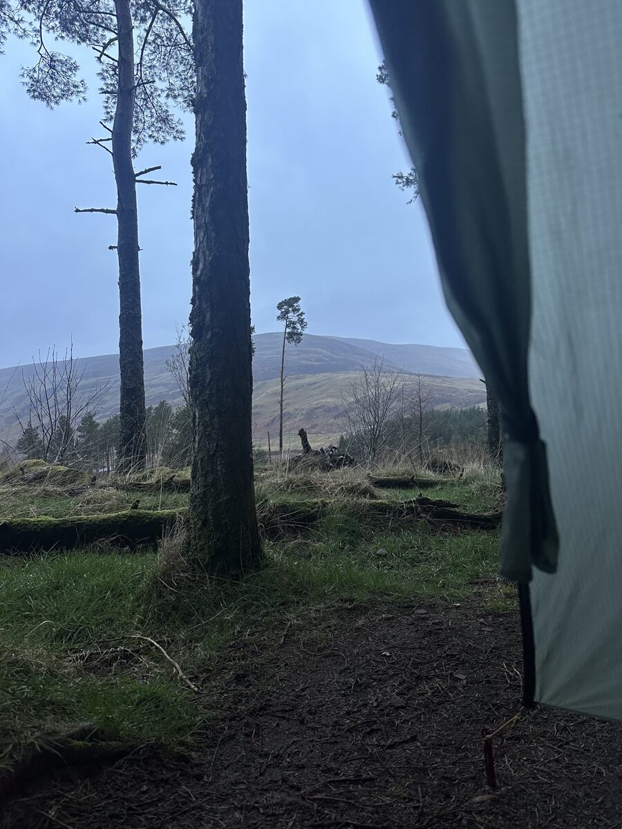 About seven miles out of Kinlochleven, just past the second set of ruins, I found a well protected wooded campsite tucked in among the trees. Quiet, sheltered, with a beautiful view out over the moorland from the tent door. I made my freeze dried dinner, the one I had been carrying since the start, and finished it off with hot chocolate and bars from the Co-op. It was a peaceful night and exactly the kind of ending the trip deserved.